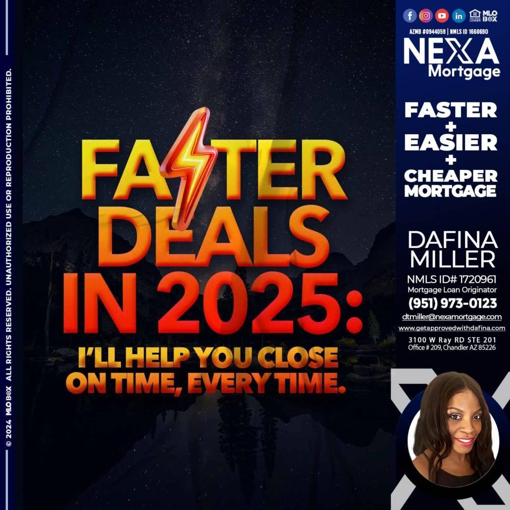 Hi, my name is Dafina Miller. I’m a Loan Officer with NEXA Mortgage LLC., offering personalized mortgage solutions, fast customized quotes, great rates and service with integrity.