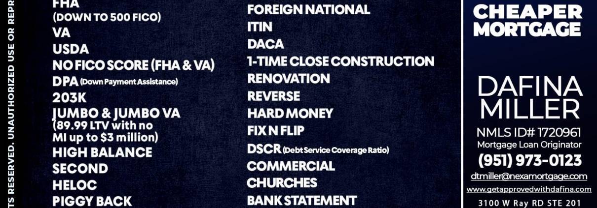 i shop 260+ - Dafina Miller -Mortgage Loan OriginatorHi, my name is Dafina Miller. I’m a Loan Officer with NEXA Mortgage LLC., offering personalized mortgage solutions, fast customized quotes, great rates and service with integrity.